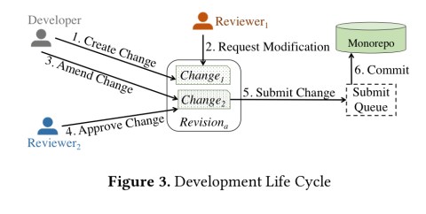 Developers create changes, which pending a review process are packaged into a revision. Revisions are submitted to the SubmitQueue for integration into the monorepo.