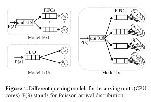 1 x 16 significantly outperforms 16 x 1. 16 x 1’s inability to assign requests to idle cores results in higher tail latencies and a peak throughput 25-73% lower than 1 x 16 under a tail latency SLO at 10x the mean service time… The theoretical results suggest that systems should implement a queueing configuration that is as close as possible to a single queue (1 x 16) configuration.