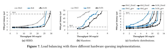 The following plots show the performance of different queueing arrangements under the three workloads, with the ‘1×16’ arrangement that RPCValet simulates performing the best as expected.