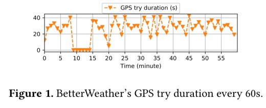 The underlying abstract model for resource usage in mobile OSes is an ask-use-release cycle. An app asks for (or tries to acquire) a resource, and assuming the resource is granted the app then uses the resource to do some work, before finally releasing it. If an app gets resources it doesn’t really need, or forgets to free thus holding onto resources much longer than it really needs, then this can place excessive drain on the battery. For example, the K-9 mail app on Android had a bug whereby it would enter an infinite retry loop when the network was disconnected or a mail server failed. For each retry, the app would acquire a wakelock, causing severe battery drain. The BetterWeather app had a similar energy failure mode when it couldn’t get a GPS signal (e.g., the phone was inside a building). It would keep searching non-stop, but never find a signal. The graph below is a one-hour trace from the BetterWeather app running on a Nexus phone inside a building.