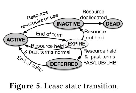 There’s a trade-off between lease length (short leases can save more energy) and the lease management overhead. After some empirical experiments, LeaseOS sets the default lease term at 5 seconds, and the default deferred interval (r) at 25 seconds. If an app has been using resources efficiently, the lease manager increases the lease term, reverting back to the 5-second lease on any sign of misbehaviour.