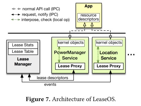 So about that twist. LeaseOS injects a transparent proxy between an app and a power-hungry OS resource. The app thinks it has control of the resource until it releases it, but under the covers the proxy is given a lease. In a traditional leasing scheme, it’s up to the borrower to request a lease extension. But here half the problem is that apps are requesting expensive resources they don’t really need. So instead the OS monitors how wisely the leased resource is being used. If an app is making good, legitimate use of the resource then the lease will be transparently extended. If it isn’t, it loses the underlying resource. How you tell whether or not an app is being a wise steward of a resource is an interesting question we’ll get into…
