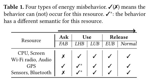 A severe type of defect developers frequently introduce in their apps is energy bugs that drain battery abnormally fast. For example, wakelock is a mechanism in Android for apps to instruct the OS to keep the CPU, screen, WiFi, radio, etc. on active state… State-of-the-art runtime techniques monitor app resource usage, and kill or throttle apps if the usage exceeds a threshold. But making heavy use of a resource does not necessarily imply misbehavior. There are legitimate scenarios where the usage is justified, e.g. for navigation or gaming.
