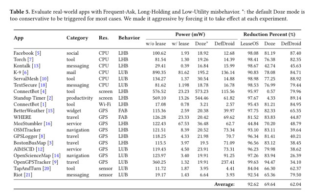 LeaseOS can significantly reduce the wasted power consumption for all cases, achieving an average reduction ratio of 92%… For all of the cases we evaluated, LeaseOS did not introduce any negative usability impact.