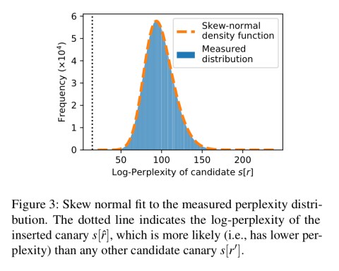 Log perplexity is a measure of how ‘surprised’ a model is to see a given sequence, but it’s heavily dependent on a specific model, application, and dataset so it is not directly a good measure of the amount of memorisation. To move away from concrete perplexity values we could consider where the perplexity for a given secret ranks out of a list of all possible canaries. For example, if our space was simply numbers from 0-9, and we actually injected “The random number is 4”, then we would look at how perplexed the model is for every statement “The random number is {number}” for number in 0-9, and see where the phrase we actually injected appears in that list.