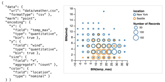Vega and Vega-lite follow in a long line of work that can trace its roots back to Wilkinson’s ‘The Grammar of Graphics.’ It’s all the way back to 2015 since we last looked at the Vega-family on The Morning Paper (see ‘Declarative interaction design for data visualization’ and ‘[Reactive Vega: a streaming dataflow architecture for declarative interactive visualisation][ReactiveVega’). Since then [Vega-Lite]VegaLite has come into existence, bringing high-level specification of interactive visualisations to the Vega-Lite world. From the look of the github repository it remains a very actively developed project to this day.