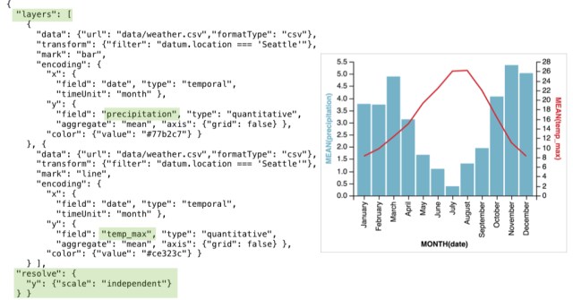 The layer operator takes multiple unit specifications as input, and produces a view with charts plotted on top of each other. By default Vega-Lite will produce shared scales and merge guides, when merging scales doesn’t make sense, you can override this behaviour to produce a dual-axis chart instead.