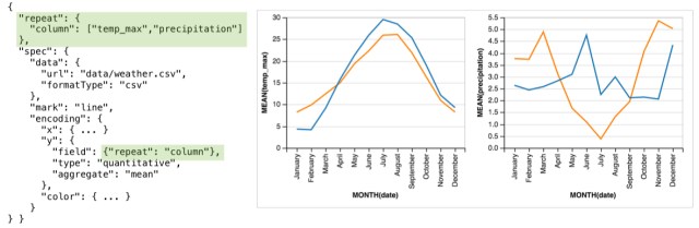 Vega-Lite provides both horizontal (charts side-by-side) and vertical (stacked charts) concatenation operators. A shared scale and axis will be used where possible.