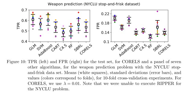 The evaluation focuses on two socially-important prediction problems: predicting which individuals will re-offend within two years (recidivism, cf. COMPAS), and predicting whether a stop-and-frisk procedure will uncover a weapon (based on NYC data).