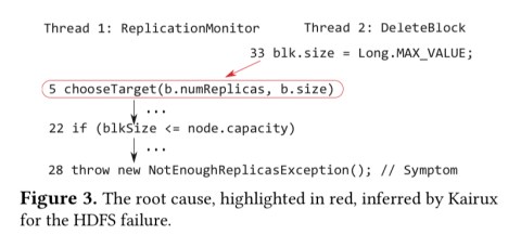 It’s been a while since we looked a debugging and troubleshooting on The Morning Paper (here’s a sample of earlier posts on the topic). Today’s paper introduces a root cause of failure detector for those hard-to-pin-down bugs. Whereas most root cause analysis systems start from the failure and work backwards, Kairux starts from the beginning of the program execution and works forwards. It’s based on the simple idea that the root cause is likely to be found where the failing execution deviates from successful executions.