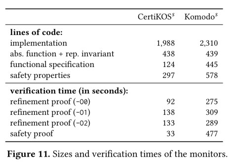 The authors port both CertiKOS and Komodo to C and assembly implementations, and verify them using Serval, in about four-person weeks each!. In both cases we’re looking at approximately 2Kloc of code, and 1Kloc of specification related material.