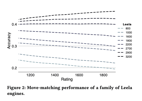 Leela engines at rating strengths of 800 to 3,200 are also tested on this task. Again, the stronger versions do best, with a maximum move-matching score of 46%. However, this prediction accuracy doesn’t vary much across human ratings, suggesting that Leela is not doing a good job of characterising or matching human play at different skill levels.