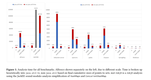 For one representative enterprise app, the authors found that a standard 2objH analysis spent almost 70% of its execution time in java.util. Way higher than the ~20% seen when analysing desktop applications. All that framework and configuration code makes for very heavy use of generic, heterogeneous data structures!